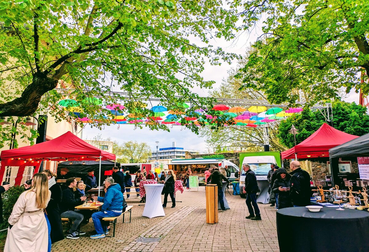 Blickt man zurück, ging der Feierabendmarkt im Jahr 2023 versuchsweise an den Start. Nach einer Umfrage unter den Gastronomiebetrieben, örtlichen Landwirten, den Wochenmarkt-Beschickern und mit der Unterstützung des Gewerbevereins IHH fanden sich zehn Betriebe an einem sonnigen Nachmittag Ende April zwischen Stadtmuseum, Haus der Vereine und Wasserschloss ein und wagten das Experiment Feierabendmarkt. Durch den örtlichen Bezug der Händlerinnen und Händler, die schöne Location und dem familiären Miteinander etablierte sich der Feierabendmarkt schnell zu einem beliebten Treffpunkt. Bis heute sind die meisten „Gründungsmitglieder“ noch als Gastgeberinnen und Gastgeber dabei, haben sich in der Ausstattung der Stände weiterentwickelt und das Angebot stetig verfeinert. Wenige sind ausgeschieden, einige neu dazugekommen.