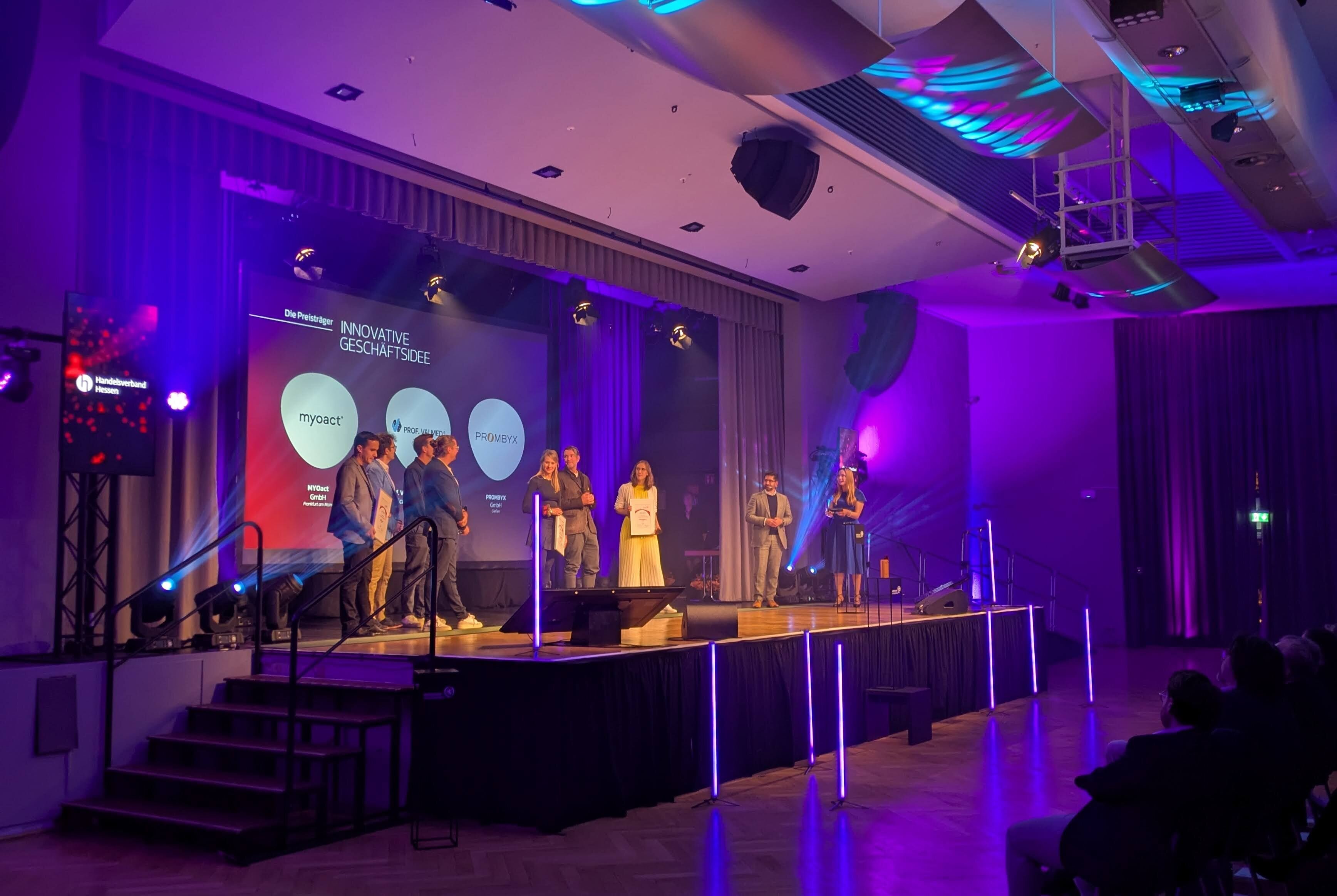 Als erster Laudator übergab der hessische Wirtschaftsminister Kaweh Mansoori die Auszeichnung an die Finalisten in der Kategorie „Innovative Geschäftsidee“: Myoact aus Frankfurt, Prof. Valmed aus Langen und Prombyx aus Gießen. „Gründerinnen und Gründer sind ein wesentlicher Treiber von Innovation. Sie verwandeln Ideen in Fortschritt und schaffen mit neuen Technologien und Geschäftsmodellen die Grundlagen für einen dauerhaft starken Wirtschaftsstandort. Der Hessische Gründerpreis macht die Vielfalt der starken Ideen aus Hessen sichtbar“, sagte Minister Mansoori, der Schirmherr des Hessischen Gründerpreises. Im Anschluss ehrte er noch Myoact als Sieger in dieser Kategorie. Sie bieten Elektromyografie (EMG)-Sensorik und -App für muskuläre Gesundheit. Prof.Valmed entwickelt eine Sprach-App mit medizinischen Informationen für Ärztinnen, Ärzte und medizinisches Fachpersonal. Prombyx beschäftigt sich mit der Nutzung von Seidenraupenpuppen als Proteinquelle und entwickelt ein Tierfutter-Protein.
