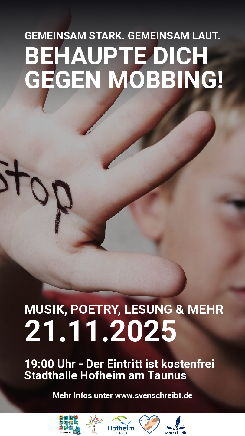 Am 21. November 2025 steht Hofheim am Taunus ganz im Zeichen des „Behaupte dich gegen Mobbing“-Tages. Gemeinsam mit der Stadt Hofheim, dem Colorful e.V. und Autor Sven Rühl findet ein vielfältiges Programm statt, das sich eindrucksvoll gegen Mobbing und Ausgrenzung positioniert.