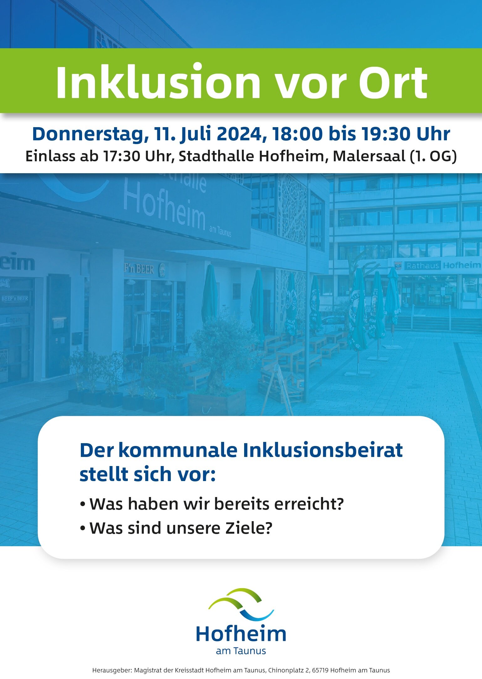 Am 29. September 2024 wird in Hofheim der Inklusionsbeirat gewählt. Im Hinblick darauf findet am Donnerstag, 11. Juli 2024, von 18.00 – 19.30 Uhr eine Infoveranstaltung statt, bei der sich der kommunale Inklusionsbeirat vorstellt und über Erreichtes sowie zukünftige Ziele spricht. Einlass im Malersaal der Stadthalle ist ab 17.30 Uhr.