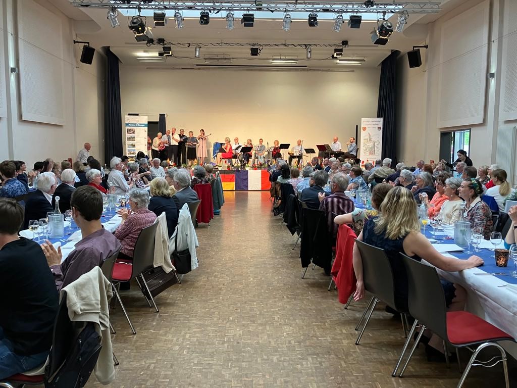 Der Abschiedsabend begann wie üblich mit kleinen Reden und das Büffet der Firma Köhler fand guten Zuspruch. Dann kam Maxence aus Chinon, bat um das Mikro und der Hallenmeister konnte das benötigte Kabel beschaffen, die Begleitmusik anwerfen und schon ging der Gesang los. Callista kam dazu und in Kürze tobte der Saal bei französischen Partyhits, deutschen Hits, es wurde getanzt, die Polonaise begann und die Stimmung war auf ihrem Höhepunkt – dank der Jugend, aber bei Alt und Jung. Kaum einen hielt es auf den Stühlen.