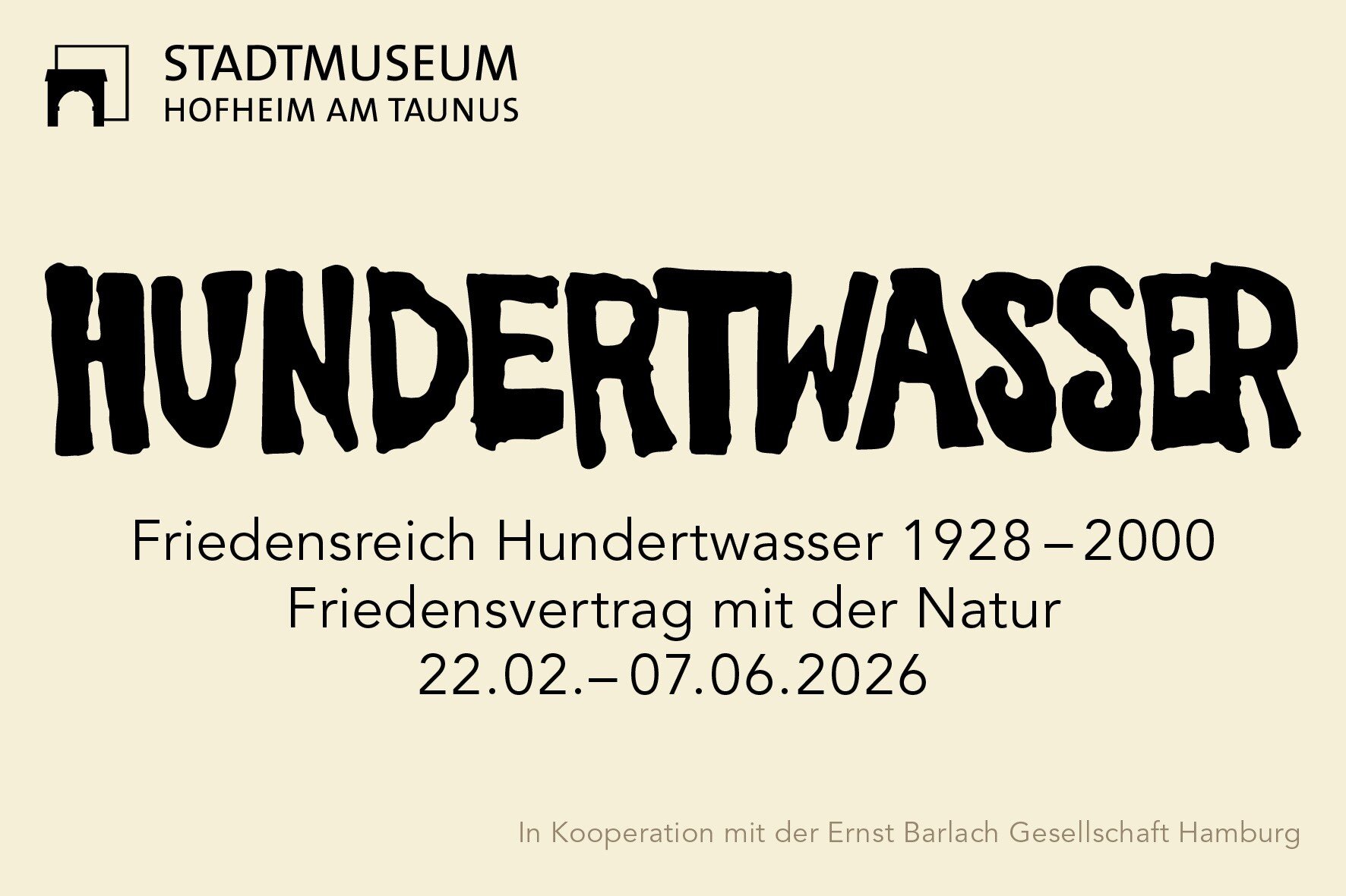 Der österreichische Künstler Friedensreich Hundertwasser hat sich bereits sehr früh mit ökologischen Themen beschäftigt und sich vehement für den Umweltschutz eingesetzt, ob in Aktion als Aktivist oder schriftlich in Form zahlreicher Manifeste wie dem 1983 verfassten „Friedensvertrag mit der Natur“. Die in Kooperation mit der Ernst Barlach Gesellschaft Hamburg ausgerichtete Ausstellung gibt mit rund 100 Exponaten einen Einblick in das vielfältige Werk Hundertwassers.